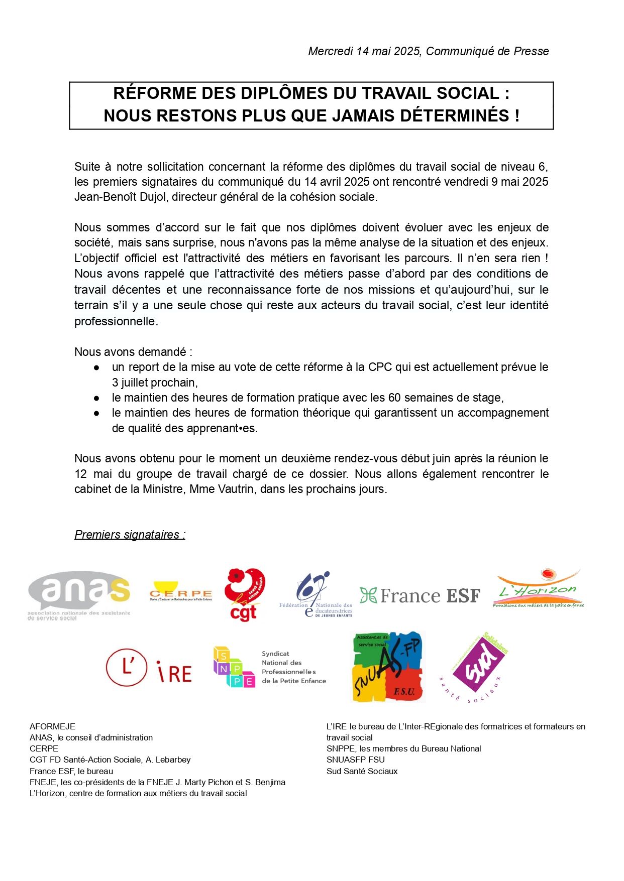 Les associations professionnelles et certains syndicats ont été reçus le vendredi 9 mai dernier par le directeur Jean-Benoit Dujol de la DGCS. Le collectif a demandé un report de la mise au vote de cette réforme à la Commission Professionnelle Consultative (CPC) qui est actuellement prévue le 3 juillet prochain,